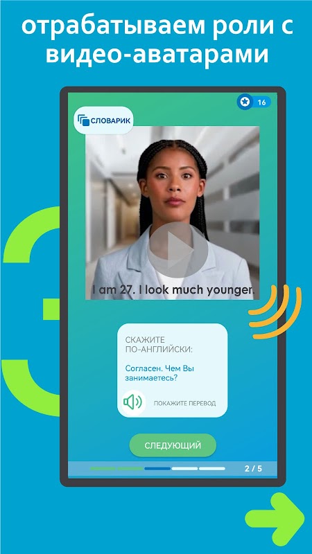ستتعلم اللغة الإنجليزية من خلال ممارسة المحادثة باستخدام صور رمزية بالفيديو تعرض مجموعة واسعة من الأصوات والنطق (الأمريكية، والأفريقية الأمريكية، والبريطانية) لتجربة غامرة، وبالتالي، تقدم أسرع في اكتساب اللغة. تعتمد دروس الحوار على أكثر مفردات وقواعد اللغة الإنجليزية شيوعًا. بهذه الطريقة، لن تتقن فقط جميع مفردات وقواعد اللغة الإنجليزية الأساسية اللازمة لإتقان المحادثة، بل ستطور أيضًا مهارات تواصل قوية باللغة الإنجليزية في 3 أشهر فقط. يتضمن التطبيق دورات: الإنجليزية للمحادثة، والإنجليزية للأعمال، والإنجليزية للسياح، والإنجليزية للانتقال إلى بلد آخر.
