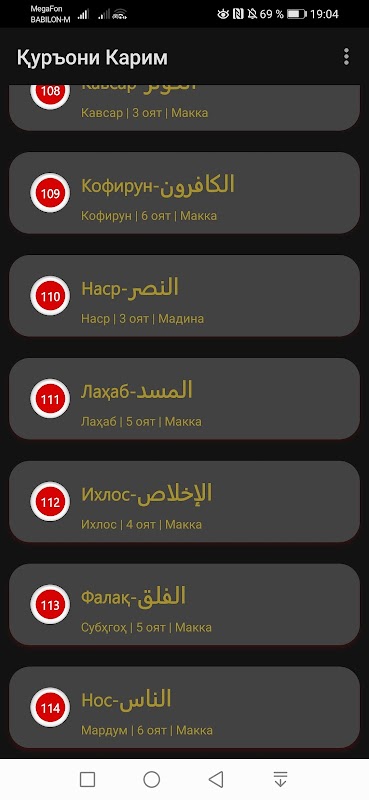 31- لقمان 32- سخدا 33- أحوزوب 34- سابا 35- فطير 36- يوسين 37- سوفوت 38- سود 39- زمر 40 - مؤمن 41 - فسيلات 42 - شورو 43 - زخرف 44 - دخون 45 - حوسية 46 - عقوف 47 - "محمد (ج)"، 48- "سمين"، 49- "حجوروت"، 50- "كوف"، 51- "زوريوت"، 52- "طور"، 53- "نخم"، 54- "قمر"، 55 - "رحمون" 56- "الوقعة" 57- "حديد" 58- "مقدلة" 59- "الحشر" 60- "الممتخانة" 61- "الصف" 62- "جمعة" , 63 - "منوفكون" . - "ظين"، 73 - "المزمل"، 74 - "المدثر"، 75 - "قيومات"، 76 - "دخر"، 77 - "مرسلوت"، 78 - "النبأ"، 79. -"نوزيوت"، 80- "عباسة"، 81- "تكفير"، 82- "إنفيتور"، 83- "مطففين"، 84- "إنشكوك"، 85- "البروق"، 86- "توريك"، 87- الو" 88- "غوشية" 89- "فخر" 90- "بلد" 91- "شمس" 92- "ليل" 93- "زوهو" 94- "انشيروه" 95- "تين" 96- "ألاك" 97- "كدر" 98- البينة 99- زلزال 100- "يوديت" 101- كوريعة 102- تقوسر 103- "يسر" , 104- الحمزات, 105- فيل, 106- قريشين, 107- مون, 108- كافسار, 109- كفيرون, 110- نصر, 111- لهب, 112 -"الإخلاص" 113- "الفلك" 114-"الأنف".