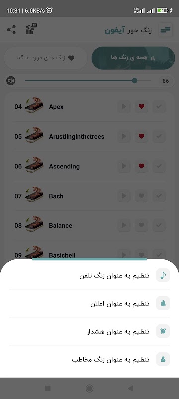 هذا برنامج نغمات رنين مجاني وشائع دون الحاجة إلى الإنترنت ، وفي هذا البرنامج يمكن اختيار أي من نغمات الرنين الشائعة لنغمات رنين الهاتف ، نغمة رنين الرسائل القصيرة ، المنبه (المنبه) وضبطها على نغمة رنين a جهة اتصال محددة.