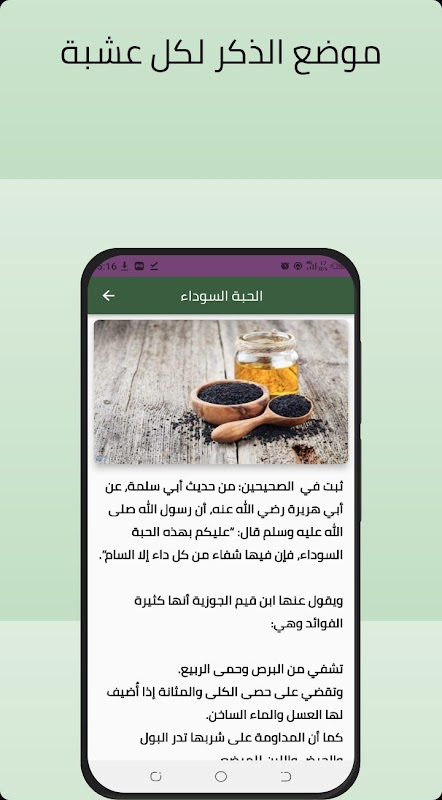 يحتوي التطبيق على أعشاب ذكرت في الطب النبوي و فوائدها.