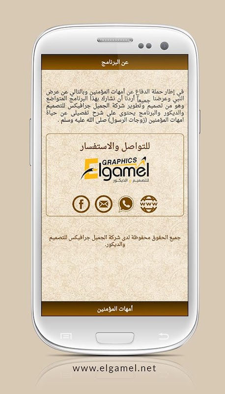 في إطار حملة الدفاع عن أمهات المؤمنين وبالتالي عن عرض النبي وعرضنا جميعاً أردنا أن نشارك بهذا البرنامج المتواضع وهو من تصميم وتطوير شركة الجميل جرافيكس للتصميم والديكور والبرنامج يحتوى على شرح تفصيلى عن حياة امهات المؤمنين (زوجات الرسول) صلى الله عليه وسلم .