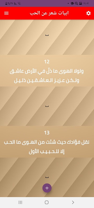 يحتوي التطبيق على أكثر من ٥٠ بيت من اجمل الأشعار عن الغرام لمختلف الشعراء