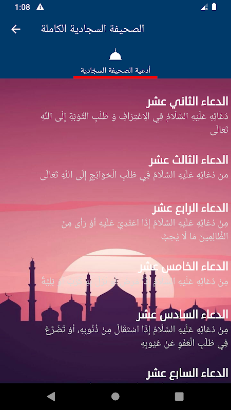 يتضمن التطبيق أدعية الصحيفة السجادية التالية: