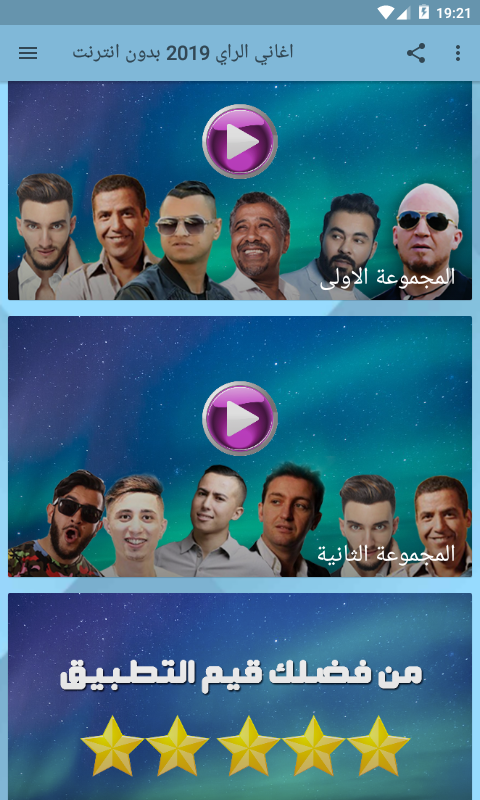 اغاني الراي بدون انترنيت هو برنامج يقدم لكم اغاني راي مغربية واغاني جزائرية راي بدون انترنت ومغربية تونسية لأهم واشهر الفنانين ويضم ويحتوي أيضا على ما يلي جديد اغاني الراي بدون نت, اغاني الراي متنوعة مغربية واظافة الى كل ذلك فالتطبيق يضم اغاني الراي القديم كوكتال واغاني الراي حزينة شعبي عروبي بدون انترنت.