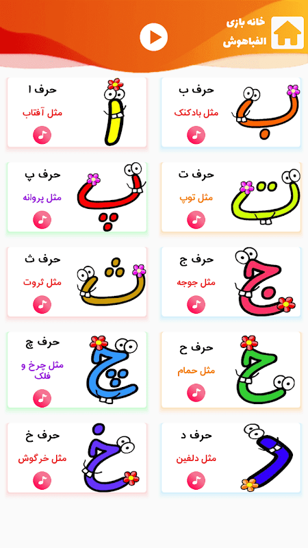 مع هذا البرنامج ، يمكن لطفلك الحبيب تعلم الحروف الفارسية إلى جانب الألعاب المختلفة والأغاني السعيدة.