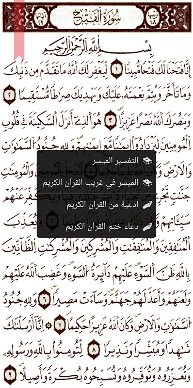 القران الكريم كاملاً دون اتصال بالانترنت وهو مطابق تماماً للمصحف الورقي بالإضافة لميزة البحث والتفسير الميسر ومعاني كلمات القرآن الكريم وأدعية من القرآن الكريم ودعاء الختم وإمكانية وضع علامة وفهرس السور وفهرس الأجزاء والأحزاب وإمكانية الانتقال لأي صفحة ويحافظ البرنامج على وضع الشاشة مضاءة لمن أراد الاستمرار بالقراءة لفترة طويلة مع إمكانية التحكم بدرجة سطوع الشاشة مع إمكانية القراءة بالوضع الليلي وفي حال إغلاق البرنامج عند صفحة معينة وفتحه مرة أخرى سيذهب تلقائياً الى الصفحة التي تم الإغلاق عندها بالضافة إلى إمكانية القراءة بالوضعين الأفقي والشاقولي وبخط واضح ولون خلفية الصفحات مريح للعين.