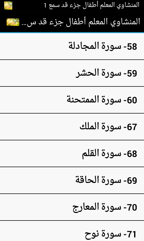 محتوى التطبيق: سور القران الكريم بصوت الشيخ المنشاوي مع ترديد الأطفال