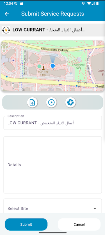 يمكن للمستخدمين كتابة وصف للطلب ، وإدخال موقع للطلب. يمكنهم أيضًا عرض الطلبات التي قاموا بإنشائها والتي لم يتم حلها حاليًا حتى يتمكنوا من متابعة تلك الطلبات.