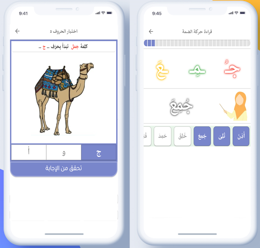 - قائمة الاختبارات، تختبر مدى تمكن الطفل من تهجي الحروف وتكوين كلمات، وفيها يختار الطفل الإجابة الصحيحة من بين كلمات متعددة تصف الصورة المعروضة عليه أو الكلمة التي تكمل الجملة مع احتساب عدد المحاولات الصحيحة والخاطئة أمامه.