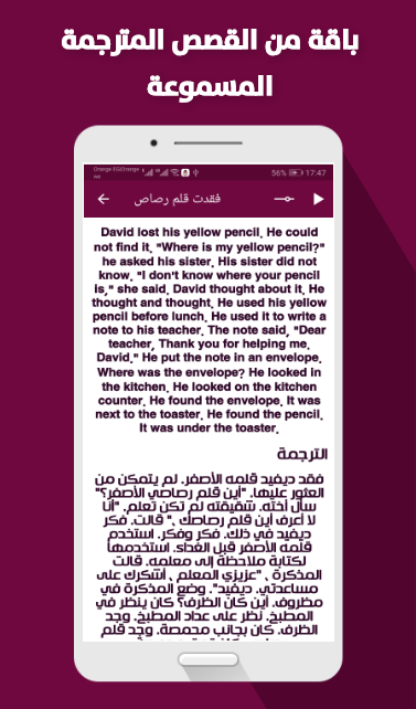 - التطبيق يحتوي علي اكثر من 80 قصه قصيرة مترجمه ومسموعه تحاكي معاك اللغه