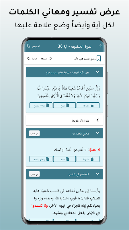 - امكانية ارسال نص الآية أو تفسيرها عبر وسائل التواصل