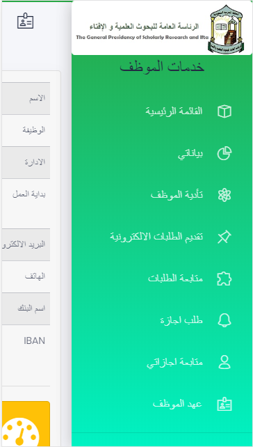 تطبيق خدمات الموظفين الرئاسة العامة للبحوق العلمية والافتاء للعمل عن بعد والتي تتضمن خدمات كاملة للموارد البشرية والمالية.