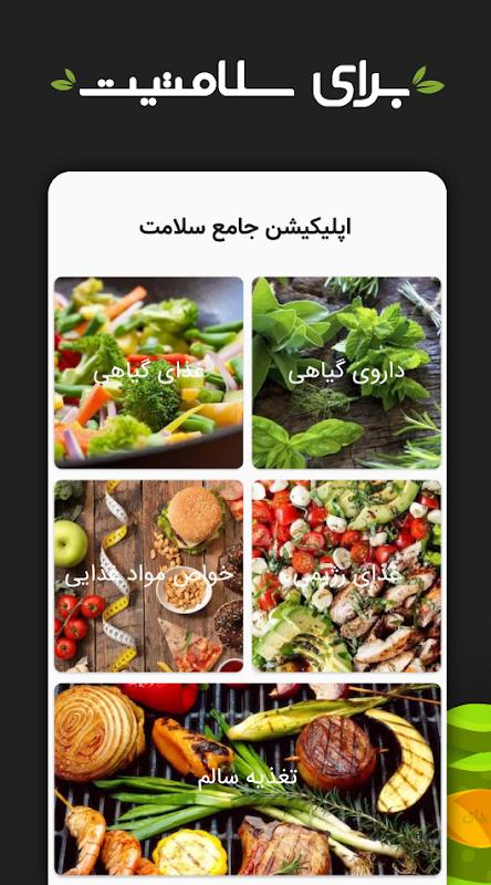 ايزن برنامه از 5 بخش اهل برنامه از بخش قسمتهای اصلی "اپلیکیشن جامع سلامت"