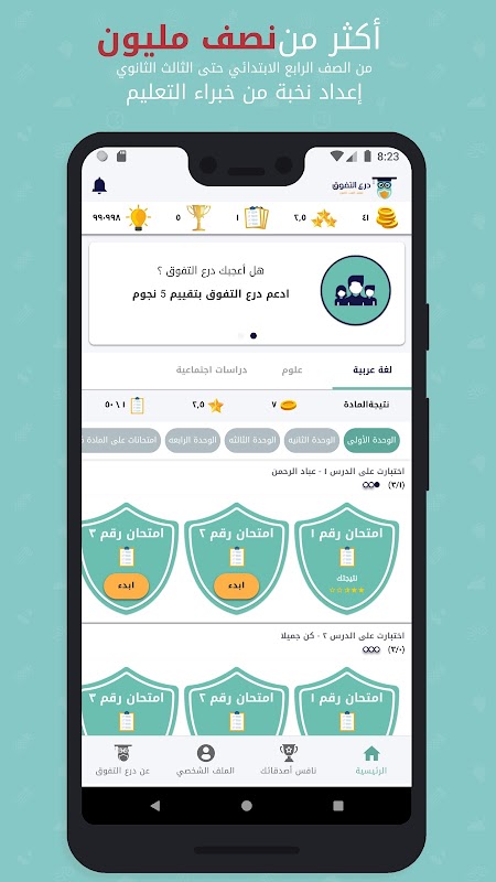 لتصبح اشطر من الجميع، نافس اصدقائك من خلال تلك الميزة الرائعة داخل التطبيق لتربح المزيد من النقاط و الكؤوس و وسائل المساعدة المجانية. لتضيف المرح للـ تعليم. اجتهد اكثر لتصبح مشهورا بين اصدقائك وتُسلط عليك الاضواء