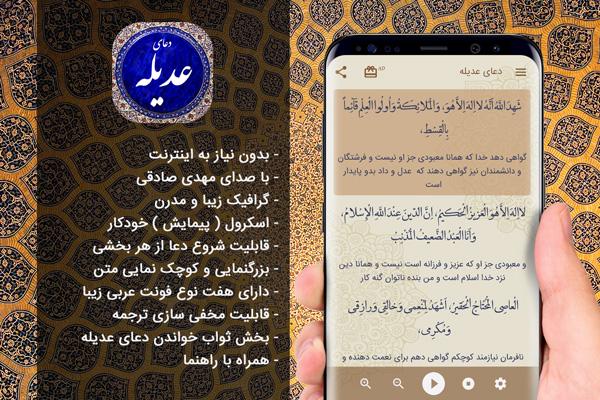 دعای عدیله صوتی با صدای زیبای مهدی صادقی .با ظاهری مدرن، بدون نیاز به اینترنت با اسکرول ( پیمایش ) خودکار و همراه با تم شب