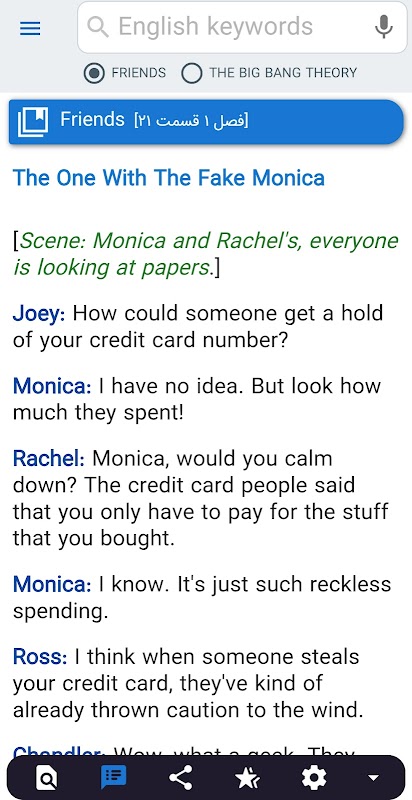 في الحوارات الإنجليزية للمحللين مع أكثر من 100.000 عبارة وأمثلة شائعة للغة الإنجليزية، تم تجميع الحوارات الإنجليزية لسلسلة FRIENDS و THE BIG BANG THEORY وتمت إضافة إمكانية البحث عن الكلمات المجمعة.