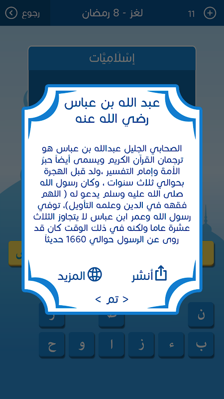 لعبة ثقافية اسلامية منوعة,كل يوم لغز جديد على مدار شهر رمضان. وصلة كلمات متقاطعة