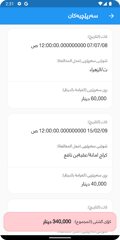بۆ وەرگرتنی زانیاری دەربارەی ئەو سەرپێچیانەی کە کردوەتە بە ئۆتۆمبێلەکەت وەک خێرا ڕۆیشتن أو ڕاگرتن لە شوێگە پێ نەدراو، وە گشت سەرپێچییەكانيتر.