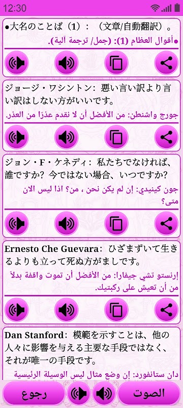 يدعم التطبيق ميزة "تحويل النص إلى كلام" وبالتالي يمكنك تعلم اليابانية بالصوت, وأيضاً يتضمن خاصية الإشعارات "Notifications" والشاشات المصغرة "Widgets" والتي تعرض في كل يوم جملة جديدة.