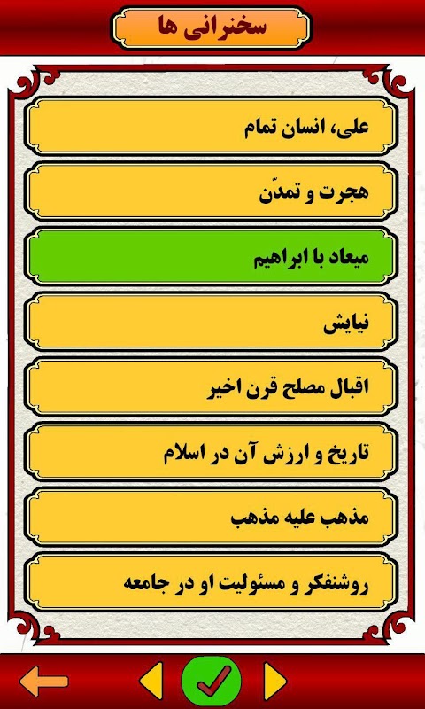 ويكرس هذا التطبيق إلى واحد من الكاتب الأكثر تأثيرا والفكري والاجتماعي، وشخصيات سياسية من إيران عصر في الثورة - الدكتور علي شريعتي. يبدأ تطبيق الصفحة الرئيسية مع واحد من يقتبس الشهيرة له في الجزء السفلي، وشجرة تنمو مع 4 فروع (الاختيارات):