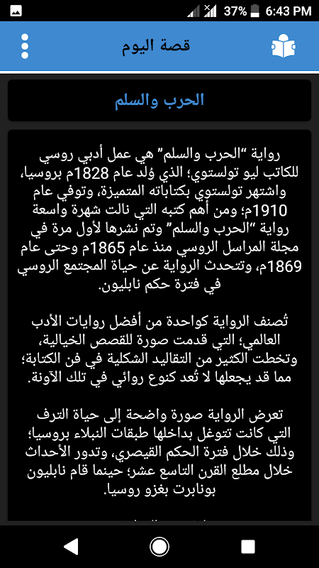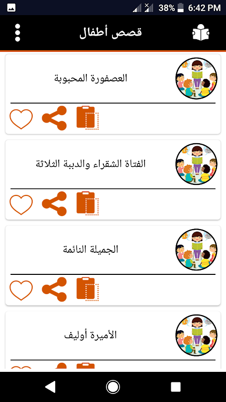 • محتوى القصة : عرض القصص المتوفرة في التطبيق حسب كل قسم، كل قصة على حدة، ويمكنكم التنقل بين مختلف القصص عن طريق لمس الشاشة من اليمين إلى اليسار أو العكس.
