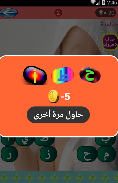 • حذف 3 حروف غير صحيحة ،لكن بعد الحصول على 25 نقطة.