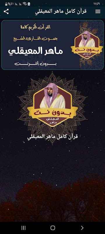 يمكنك من خلال تطبيق القرآن الكريم بصوت ماهرالمعيقلي سماع سور القرآن الكريم كاملة عن طريق هاتفك المحمول أو جهازك اللوحي من خلال هذا البرنامج به جميع سور القرآن الكريم، وتطبيق تلاوة القرآن بصوت القارئ الشيخ ماهرالمعيقلي هو تطبيق مجاني موجود على المتجر لهواتف الأندرويد. استمتع بتلاوة القرآن الكريم بصوت الشيخ ماهر المعيقلي بدون انترنت.