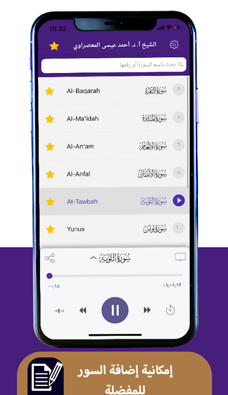 - إمكانية الاستماع إلى تلاوات الشيخ بدقة صوت عالية.
