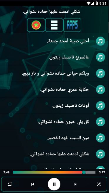 تطبيق اغاني سورية منوعة هو تطبيق اندرويد مجاني يضم اغاني منوعة للفنانين السوريين ناصيف زيتون و امجد جمعة و فهد القصير و حماده نشواتي و ربيع العمري ونقدم للمستمع خدمة سماع الاغاني بدون الحاجة الى ان تكون متصلا بالانترنت واليكم محتوى التطبيق :