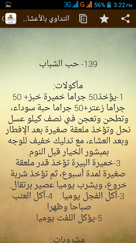 * يرسل لك التطبيق كل يوم مرضاً وعلاجه بالأعشاب الطبيعية على موبايلك وبدون الاتصال بالانترنت ولكن فقط بعد تحميل التطبيق اضغط على معلومة اليوم من داخل التطبيق