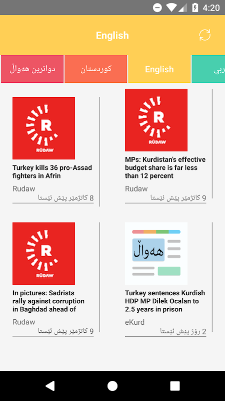 نجمعها على آخر الأخبار من العديد من وكالات الأنباء وقائمة بهم إلى التطبيق واحد بالنسبة لك! يتم فرز الأخبار حسب تاريخ حتى تتمكن من رؤية أحدث الأخبار في أعلى القائمة. مصادر لكردستان للأنباء هي ما يلي: