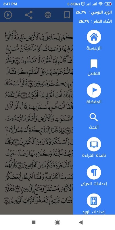 وتستطيع التلاوة آية آية عن طريق النافذة المنبثقة عند فتح قفل الشاشة أو بالضغط على "قراءة مستمرة" لينقلك إلى التطبيق لتقوم بالقراءة المستمرة بالسحب لأعلى وأسفل أو بالعرض في صفحات .