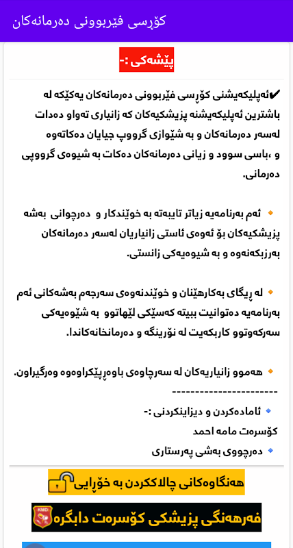 ✔ ئەپلیکەیشنی کۆڕسی فێربوونی دەرمانەکان یەکێکە لە باشترین ئەپلیکەیشنە پزیشکیەکان کە زانیاری تەواو دەدات لەسەر دەرمانەکان و بە شێوازی گرووپ جیایان دەکاتەوە و ،باسی سوود و زیانی دەرمانەکان دەکات بە شیوەی گرووپی دەرمانی.
