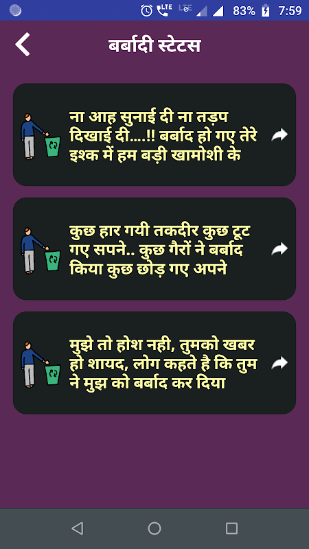 This is one of the best collection of latest Barbadi shayari app which is totally free and no internet connection required . Lover is one of the important part of human life for share there feelings to some we must need a proper text which is attached by our emotion for that this is best and suitable app for you just use and share ultimate feelings .