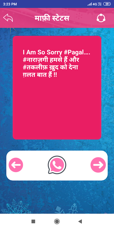 تطبيق Maafi Shayari & Sorry Status لديه واجهة سهلة الاستخدام وقاعدة بيانات كبيرة .. الآن قم بتغيير حالتك يوميًا مع كل حالة آسف وتطبيق shayari. لدينا مجموعة فريدة وأحدث حالة آسف باللغة الهندية.