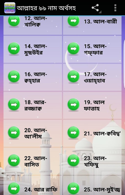 ইমাম তিরমিজি (রহ.) এক হাদিসে মহান আল্লাহর ৯৯টি গুণবাচক নাম উল্লেখ করেছেন। হজরত আবু হুরায়রা (রা.) হাদিসটি বর্ণনা করেছেন। তিনি বলেছেন, হজরত রাসূলুল্লাহ (সা.) বলেন, মহান আল্লাহর ৯৯টি নাম আছে, অর্থাৎ এক কম ১০০টি। যে ব্যক্তি সেগুলো সংরক্ষণ (মুখস্থ) করবে সে জান্নাতে যাবে।99 Names of Allah with Bangla pronunciation and meaning. This is very good bangla free Islamic application from which you can learn all names Of Allah and their meaning in Bangla. Please try our other applications named as 1 bangla TV 2 bangla newspaper 3 bangla jokes 4 bangla small sura 5 bangla waj 6 bangla song 7 99 names of Allah in bangla.