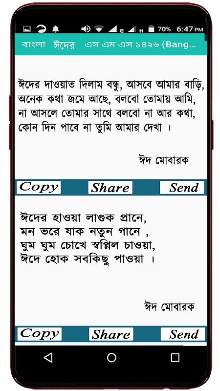 সামনে আসছে ঈদ - eid তাই আমরা আপনাদের জন্য নিয়ে এলাম ঈদের শুভেচ্ছা মেসেজ। ঈদে আপন জনদের ঈদ মোবারক শুভেচ্ছা এস এম এস পাঠাতে হয় আর এসএমএস পাঠাতে হলে প্রয়োজন হয় সুন্দর ছন্দ মেলানো ঈদের শুভেচ্ছার মেসেজ কিন্তুু অনেকেই পারেন না মেসেজ সিজিয়ে লিখতে তাদের জন্য আমাদের এই অ্যাপটিতে থাকছে বেশ কিছু eid sms যেটা ভালো লাগে কপি বা সেন্ড অপশনে ক্লিক করে আপন জনদের কে পাঠিয়ে দিন।