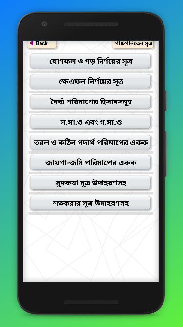 গণিতের সূত্রাবলী এবং গণিত সমাধান খুব সহজে করার পদ্ধতি নিয়ে আমাদের এইবারের আয়োজন। অংক সমস্যা ও সমাধানের জন্যে অংকের সূত্র জানা প্রয়োজন। গনিতের সকল সূত্র জানা থাকলে অনায়াসে যে কোন পাটিগণিতের সমাধান ، বীজগণিত সমাধান সহজে করাই সম্ভব। গনিতের শর্টকার্ট (تقنيات الاختصارات الرياضية) টেকনিক জানা থাকলে অতি সহজে অংক করার সহজ পদ্ধতি আয়ত্ত করা সম্ভব। পাটিগনিত নিয়ে আমাদের ছোট বেলা থেকেই একটা ভীতি কাজ করে। কিন্তু কেউ যদি পাটিগণিতের সূত্র গুলো মুখস্থ করে পাটিগনিতের উদাহরণ গুলো অনুশীলন করে তাহলে এই ভীতি অনেকাংশেই কেটে যাবে। বীজগণিতের সকল সূত্র ও দেয়া হয়েছে আমাদের এই অ্যাপটিতে। অনেকেই আমরা বড় হবার সাথে সাথে জ্যামিতির সংজ্ঞাগুলো ভুলে যাই। জ্যামিতির বই নিয়ে সর্বাবস্থায় তো চলাফেরা করা সম্ভব নয়। আমাদের অ্যাপটি তে জ্যামিতির সকল সংজ্ঞা দেয়া আছে পরিমাপের সকল সূত্র এবং পরিমিতির সকল সূত্র সহকারে। আপনি যখন সময় একনজর চোখ ভুলিয়ে নিতে পারেন সূত্রগুলো ও সংজ্ঞা গুলো।
