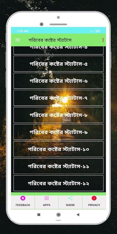 গরিবের কষ্টের স্ট্যাটাস এই অ্যাপসটি থেকে আপনারা পাবেন গরিব জীবনের কষ্টের স্ট্যাটাস-SMS Sad Status । গরিবের ভালোবাসার কষ্টের স্ট্যাটাস ও মজার স্ট্যাটাস । গরিব ও মধ্যবিও দের কষ্টের কিছু উক্তি বা স্ট্যাটাস পাবেন এই অ্যাপসটিতে । গরিব ও মধ্যবিওদের অনেক স্বপ্ন পূরন হয় না।যা এই অ্যাপসটির মাধ্যমে কিছু কথা সাজিয়ে স্ট্যাটাস বানানো আছে য়া আপনারা ফেসবুকে শেয়ার করতে পারবেন।মনে কষ্টের কথা গুলো।