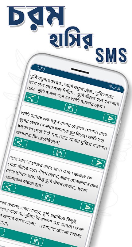 আশা করি ভালো লাগবে আপনাদের মেয়েদের হাসানোর এসএমএস স্ট্যাটাস। তাই এই অ্যাপটি হাসির SMS দিয়ে সাজানো হয়েছে। الرسائل القصيرة গুলো খুব সহজে পাঠাতে পারেন আপনার বন্ধুদের কাছে।