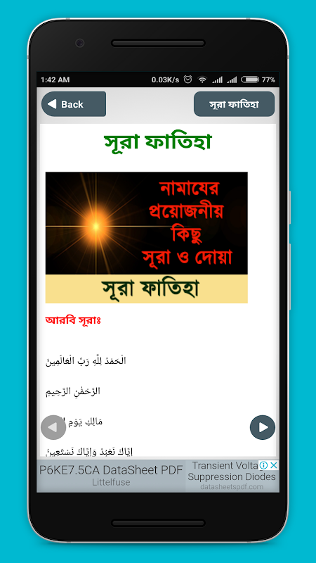নামাজের ছোট সুরা ও দোয়া সমূহ namaj surah নিয়ে এই ইসলামিক এপস যা দরকারি কিছু namajer sura o dua নামাজের সুরা ও দোয়া সমূহ আরবি, বাংলা অর্থ ও উচ্চারণ দিয়ে সাজানো হয়েছে। নামাজ বা সালাত ইসলামের ৫ টি স্তম্ভের একটি। মহান আল্লাহপাক আমাদের জন্য সময়মত namaj time দৈনিক ৫ ওয়াক্ত নামায ফরয করেছেন। নামাজের সময়সূচী namajer somoy suchi অনুসারে সঠিক সময়ে প্রত্যেক মুসলিমের নামাজ আদায় করা উচিৎ। পবিত্র কুরআন শরীফ এর সূরা সমুহ এর অংশবিশেষ নামাযের সময় আমরা পড়ে থাকি। তাই সূরা সব surah এর মধ্যে ছোট সূরা সমূহ choto choto surah মুখস্ত করতে সুবিধা হয়। পবিত্র কুরানের সব সূরা ই নামাজের সূরা সমূহ namajer sura somuho হিসেবে পড়া যায়। তার মধ্যে থেকে কিছু choto surah bangla ছোট সূরা উচ্চারন-অর্থ সহ এই namaz bangla বাংলা এপ টিতে দেয়া আছে যা আশা করি আপনাদের কাজে আসবে।