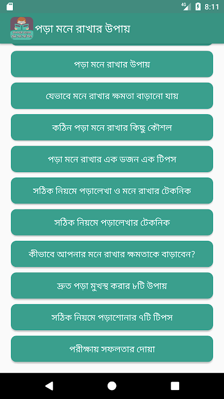 পড়া মনে রাখার উপায় নিয়ে তৈরি করা হয়েছে আমাদের এই এপ্সটি । পড়া মনে থাকে না কিংবা যাই পড়ি না কেন তাই ভুলে যাই । এই রকমের অভিযোগ প্রায় সকলেরই । পড়া মনে না থাকা নিয়ে কম বেশি সবাই হতাশায় ভুগে থাকেন । তবে এই বিষয়টি নিয়ে হতাশ হলে চলবে না । পড়া মনে রাখার সহজ কয়েকটি কৌশল মনে চললেই পড়া মনে রাখা সম্ভব । আর পড়া মনে থাকার উপায় বা পড়া মনে থাকার কৌশল নিয়ে আমাদের এপ্সটি । পড়া বেশি বেশি মনে রাখতে হলে সর্বপ্রথম পড়ার জন্য সময় অনুযায়ী রুটিন করে নিতে হবে যেন আপনি পড়ালেখায় আপনার মনযোগ ঠিক থাকে বা বৃদ্ধি পায় । পড়াশুনার সাথে বুদ্ধিমত্তার ও স্মৃতিশক্তির অনেটাই সম্পর্ক বিরাজমান । আপনার বা আপনাদের স্মৃতিশক্তি ও বুদ্ধিমত্ত্বা যত বেশি হবে আপনার পড়া তত বেশি পরিমানে মনে থাকবে । পড়া মনে রাখার জন্য স্মৃতিশক্তি ও বুদ্ধিমত্বার একটি অন্তর্নিহিত সম্পর্ক রয়েছে । বুদ্ধি , জ্ঞান বৃদ্ধির উপায় হিসেবে আপনি নানা প্রকার বুদ্ধির প্রশ্ন বা বুদ্ধির বৃদ্ধির নানা কলাকৌশল নিয়ে চেষ্ঠা করতে পারেন । আমাদের মাথা এক অনন্য জটিলতর তথ্যর কারখানা । এর ক্ষমতা অপরিসীম ।