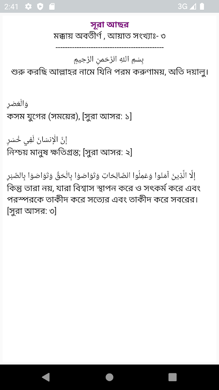 এখানে ৩০ ছোট আকারের সুরা বাংলায় এবং অর্থসহ তাফসীর দেওয়া হয়েছে। প্রতিটি সুরার সাথে বিখ্যাত কারীগনের অডিও দেওয়া হয়েছে। আমরা যারা সয়ের অভাবে বাহিরে গিয়ে সুরা শিখতে পারছেন না তাদের জন্য এই অ্যাপলিকেশনটি অনেক উপকার হবে। তাছাড়া এখানে নামাজের যাবতিয় দোয়া দেওয়া হয়েছে এবং নামাজের সকল প্রকার নিয়ম পাট বাই পাট সুন্দর করে বুঝিয়ে দেওয়া হয়েছে।