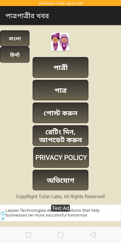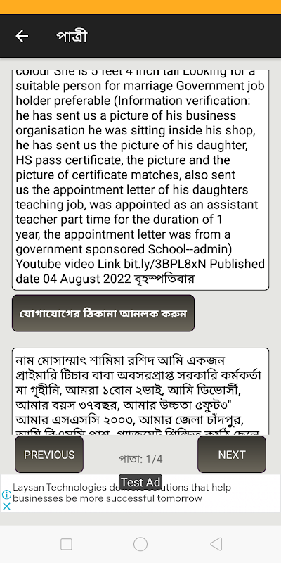♣♣♣ পাত্রপাত্রীর খবর অ্যাপটি আপনাদের দারা এবং আপনাদের জন্য কাজ করে থাকে। এর মাধ্যমে বাংলাভাষী দেশী ও প্রবাসী বহু মানুষ তাদের জীবনসঙ্গিনী খুজে পেয়েছেন। বর্তমানে আমরা ইমেইল ভেরিফাই করে তথ্য নিয়ে থাকি। আপনার কোন পোস্ট সম্পর্কে অভিযোগ থাকলে আমাদের অ্যাপ এর অভিযোগ মেনু ব্যবহার করুন।