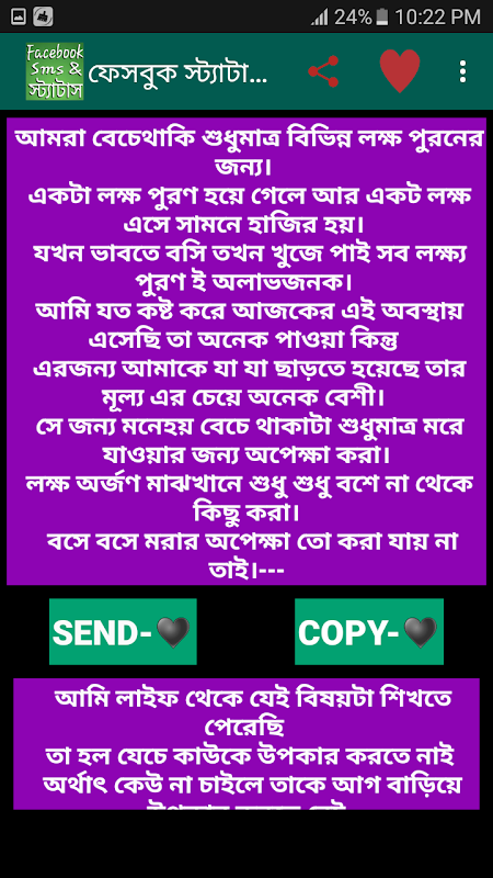 ফেসবুকে মানুষ তার মনের বিভিন্ন দুঃখ বেদনা কষ্টের কথা সেয়ার করে। বিভিন্ন মজার মজার তথ্য, প্রেমের ছন্দ,ভালোবাসার কথা, মেয়ে পটানোর উপায়, love sms,love massage,ভালোবাসার মেসেজ,প্রেমের উক্তি,ভালোবাসার উক্তি, বাংলা মেসেজ, প্রমের চিঠি,প্রেমের কবিতা,অনলাইনে আয় করার উপায়,ফেসবুক আয় করার উপায়,ইংরেজী শিক্ষা,অবাক করা তথ্য ,জানা অজানা তথ্য,প্রেম কাহিনী, গান, গজল,নামজ পড়ার নিয়ম,হাদীস, সূরা আরো অনেক কিছু।অনেকে ক্রিকেট খেলা,ফুটবল খেলা সহ সব খেলার তথ্য দেয়।খেলোয়ার দের জীবনি, কে কি করে,সব কিছুই দেয়।যারা ডাক্তার তারা বিভিন্ন ঔষধ,রোগ মুক্তির দোয়া, শক্তি বৃদ্ধি,হুমিও প্যাথি ইত্যাদি দেয়।যারা ফ্যাশন সচেতন তারা ছেলেদের রূপচর্চা, মেয়েদের রূপচর্চা, ফ্যাশন, স্টাইল, চুলের স্টাইল, মডেল এগুলো শেয়ার করে থাকে।কিন্তু অনেকেই আছে অনেক দিন ফেসবুক চালান অন্যের স্ট্যাটাসে like দেন। নিজে কোনো দিন স্ট্যাটাস দেন না।বা কি লিখবেন তা খুজে পান না।তাদের জন্য আমার এ এ্যাপ্স।