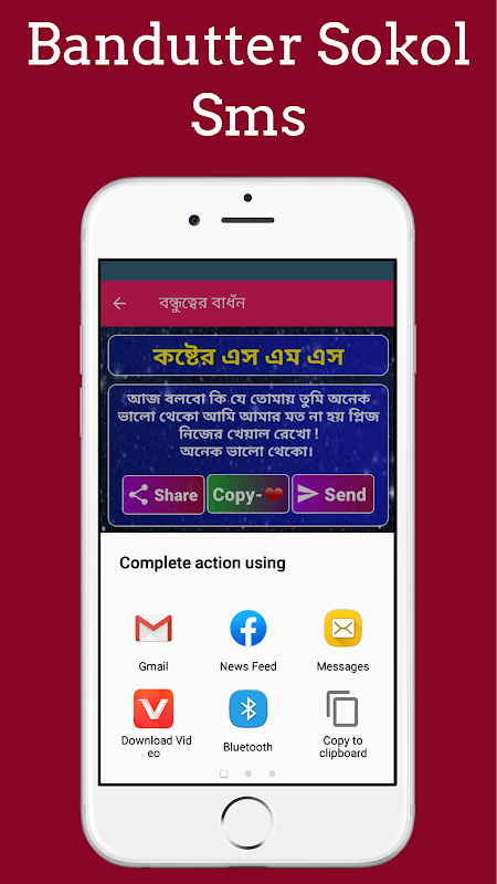 সবাইকে আন্তরিক ভাবে ধন্যবাদ। প্রথমেই আমার সালাম গ্রহন করবেন। আমাদের অ্যাপের মধ্যে আপনি বন্ধুত্বের সকল এসএমএস খুব সহজেই পেয়ে যাবেন। প্রতিটি এস এম এস "Share""COPY""Send" এই তিনটি পর্যায়ে আপনি আপনার মনের মানুষকে পাঠাতে পারবেন।শুধু আপনাদের সুবিদার্থে আমার অক্লান্ত পরিশ্রমের ফলশ্রুতিতে এই অ্যাপটি বানানো।