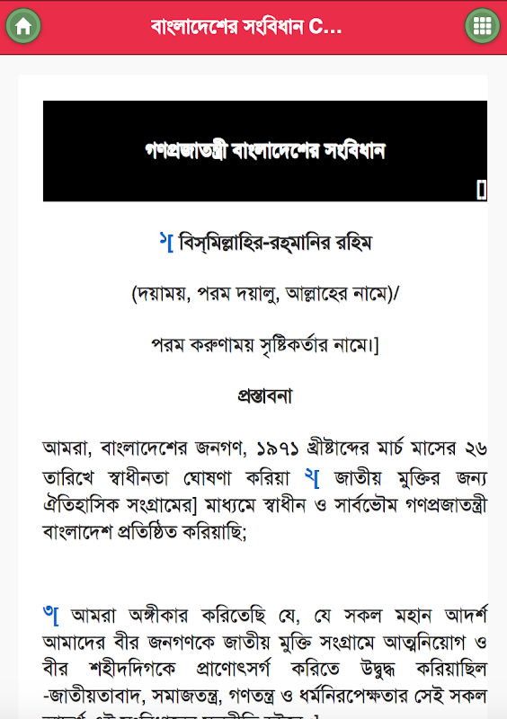 সম্পূর্ণ বাংলা ভাষায় গণপ্রজাতন্ত্রী বাংলাদেশ সরকারের সংবিধানটি (Constitution of Bangladesh in Bengali) পড়তে ও জানতে এই একটি অ্যাপই আপনাকে সাহায্য করবে। স্বাধীন দেশের নাগরিক হিসেবে আমাদের সবারই সংবিধানের ধারা সম্পর্কে ভালো ধারনা থাকা অত্যাবশ্যক।