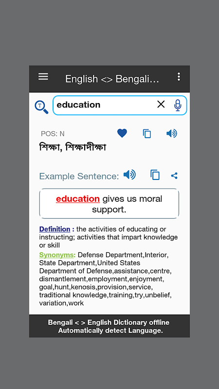 القاموس البنغالي والإنجليزي في وضع عدم الاتصال. نظام بحث سهل يكتشف تلقائيًا اللغة الإنجليزية والبنغالية عند كتابة كلمة في مربع البحث.