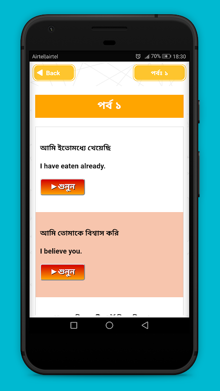 يجب ممارسة تطبيق ترجمة الجمل البنغالية إلى الإنجليزية يوميًا لمعرفة النطق الصحيح للغة الإنجليزية. هذا سيجعل التحدث باللغة الإنجليزية أسهل بكثير. إذا كنت ترغب في تحسين لغتك الإنجليزية المنطوقة ، فلا يوجد بديل لممارسة الترجمة الإنجليزية. ليس هذا فقط ، إذا كنت لا تعرف المعنى البنغالي للكلمات الإنجليزية مع النطق ، فهناك فرصة كبيرة لارتكاب الأخطاء. لذلك أضاف هذا التطبيق الترجمة وكذلك النطق الصحيح للغة الإنجليزية.