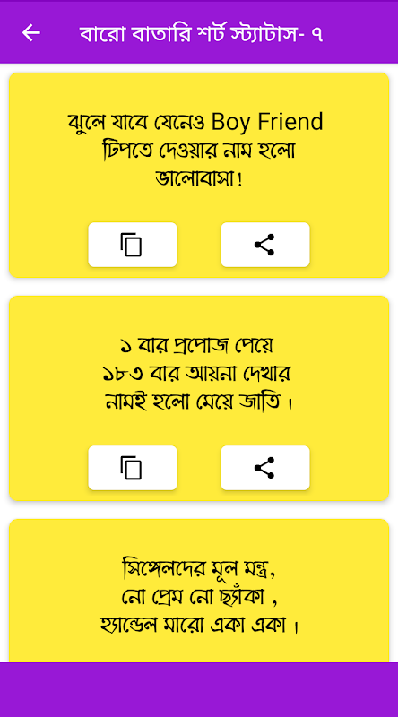 এবং প্রত্যেক টি স্ট্যটাস টি আপনাদের কাছে খুবই ভালো লাগবে - আমাদের এই অ্যাপের মাধ্যমে প্রত্যেক টি স্ট্যাটাস শেয়ার করার সুবিধা রয়েছে ।